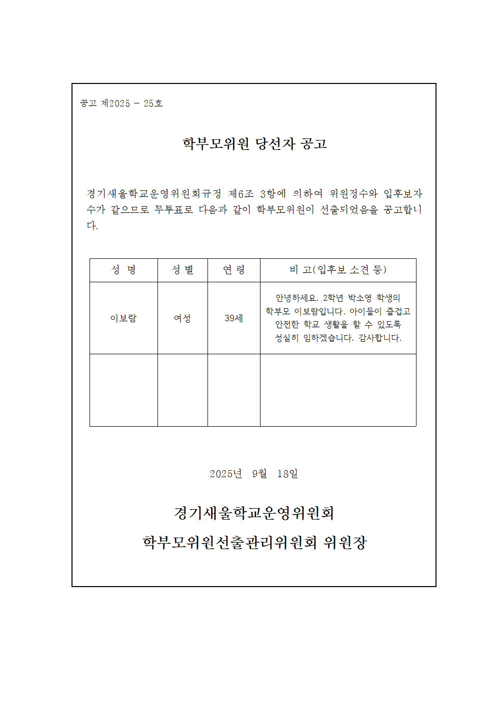 2025학년도 경기새울학교운영위원회 보궐선거 학부모위원 당선자 공고